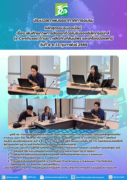 ประมวลภาพบรรยากาศการอบรมหลักสูตรออนไลน์เรื่อง การเพิ่มประสิทธิภาพด้านการส่งออกด้วยใบรับรองอิเล็กทรอนิกส์ (e-Certificate) ด้านยา, ผลิตภัณฑ์สมุนไพร และเครื่องมือแพทย์