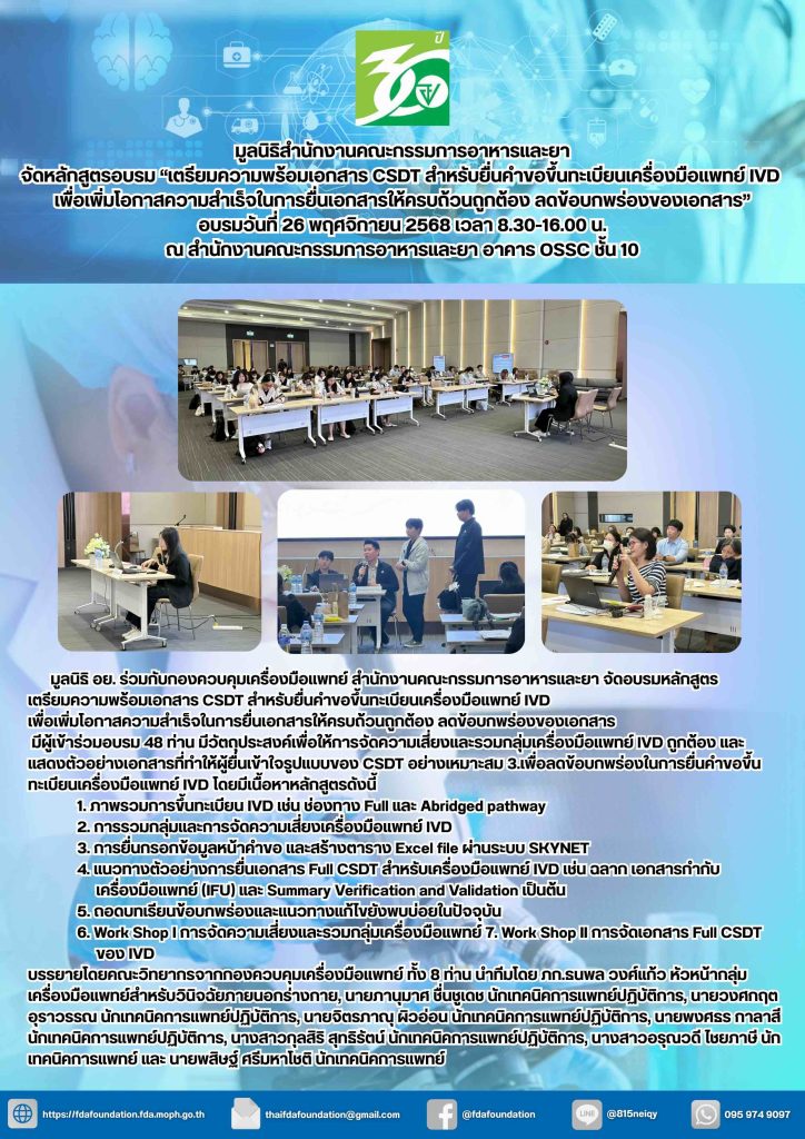 วันที่อบรม วันที่ 2-3 ตุลาคม 2568 ระยะเวลาอบรม 2 วัน เวลา 8.30-16.30 น. ณ. สำนักงานคณะกรรมการอาหารและยา อาคาร OSSC ชั้น 10